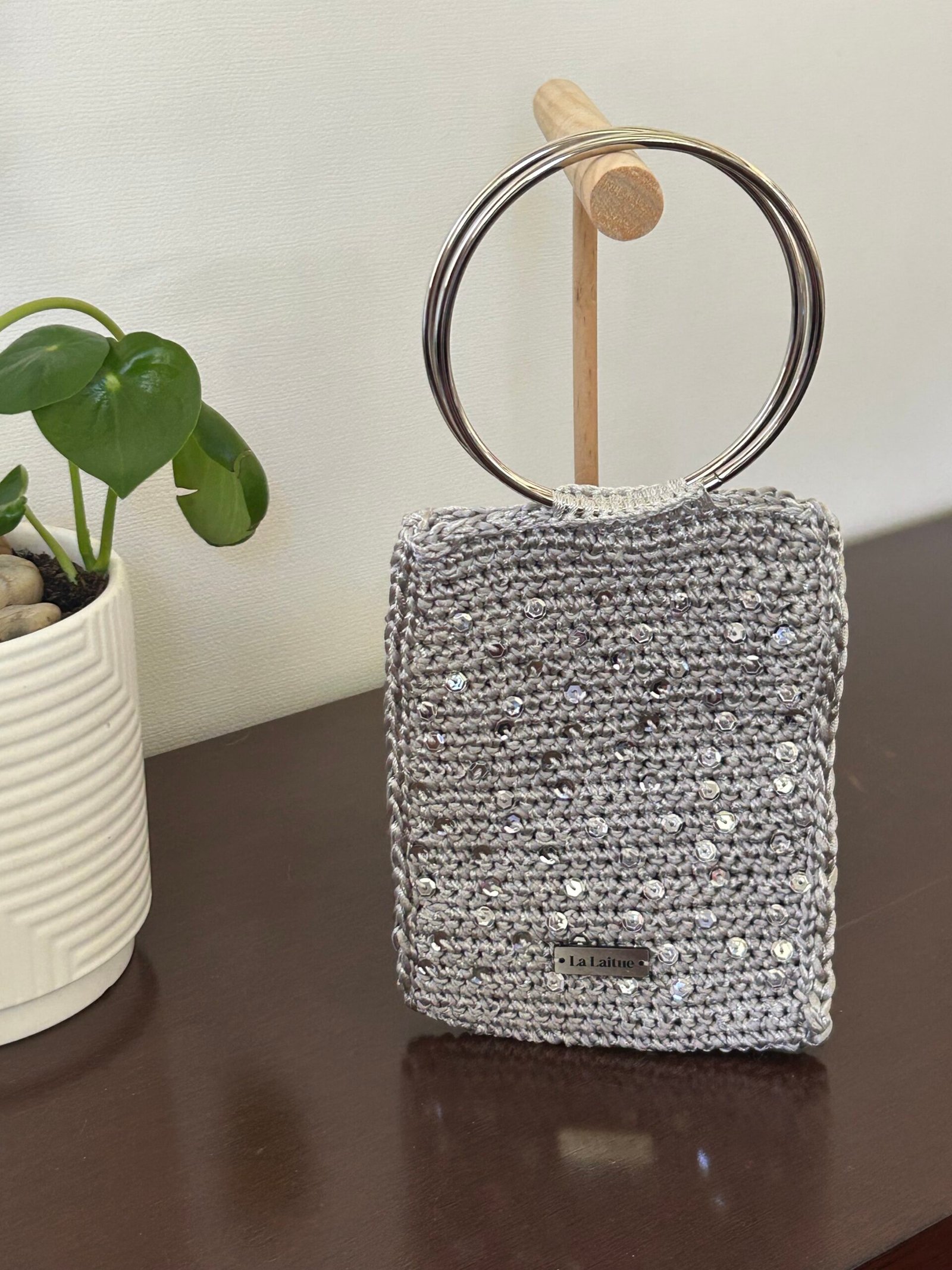 Cartera tejida a mano con hilo cola de ratón, con lentejuelas. Manillas metálicas plateadas.