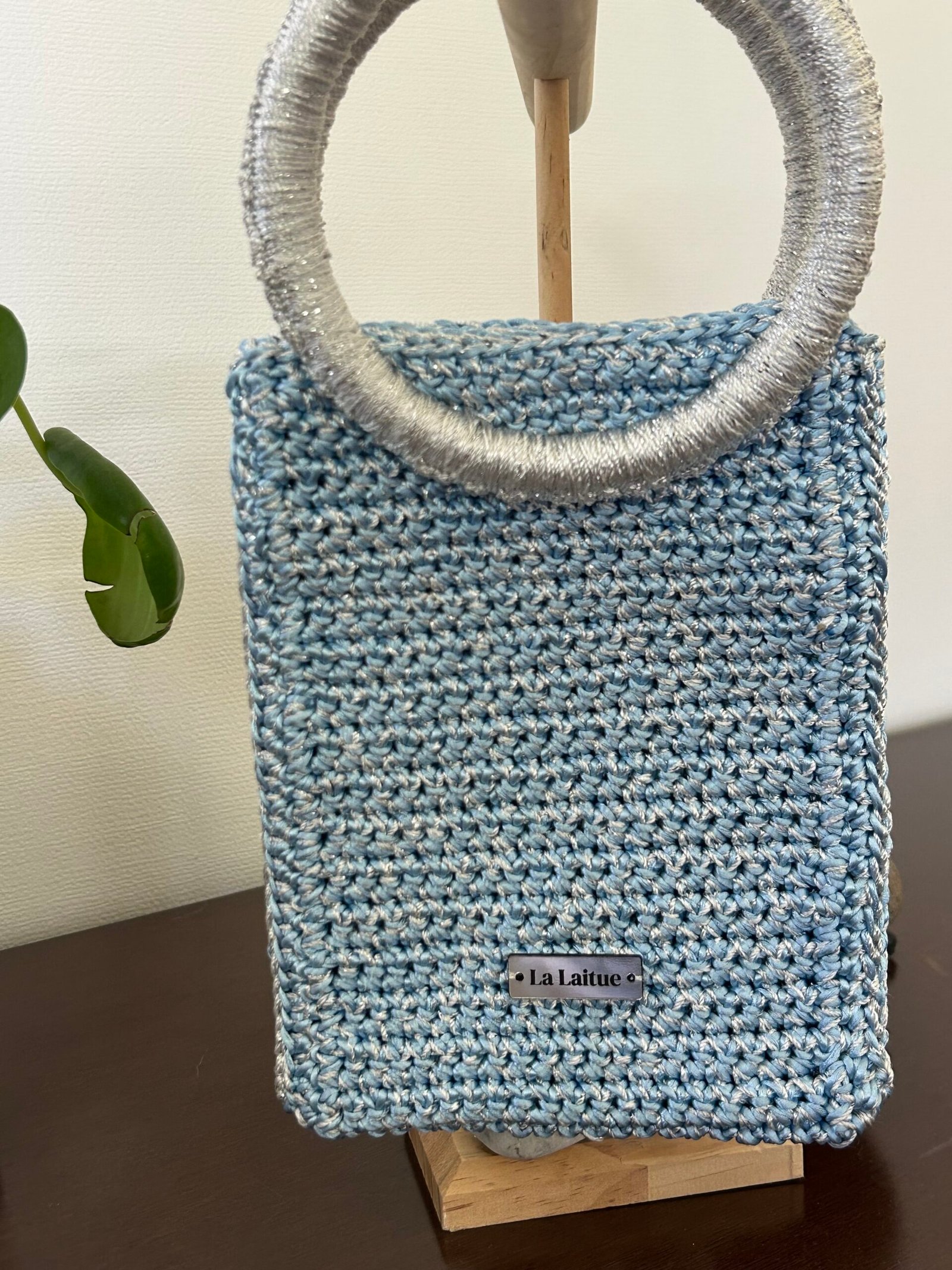 Cartera tejida a mano, con hilo cola de ratón e hilo metalizado, argollas de hilo metalizado.