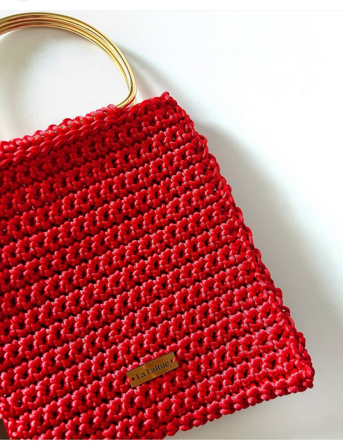 Cartera tejida a mano con hilo cola de ratón. Manillas metálicas doradas.