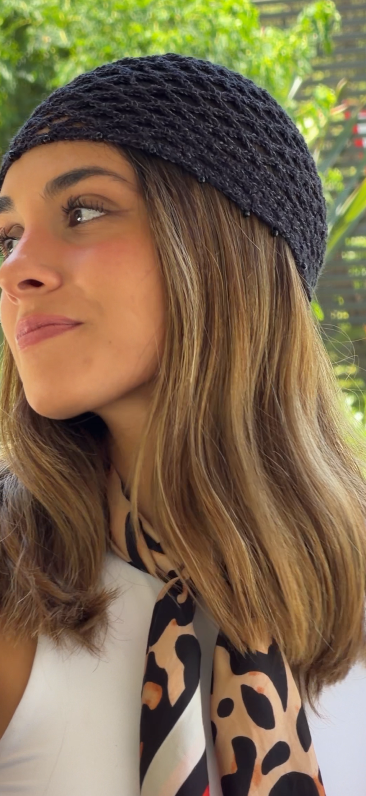 Casquete tejido a mano, con hilo de algodón y mostacillas.